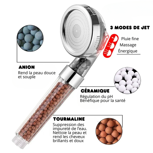 Pommeau de Douche Écologique Haute Pression 3 Jets Relaxants - Recharge Billes OFFERTE