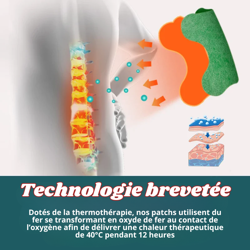 Dotés d’une technologie brevetée utilisant du fer se transformant en oxyde de fer au contact de l’oxygène, les patchs s’activent automatiquement lorsqu’ils sont exposés à l’air. Ils délivrent une chaleur thérapeutique de 40°C pendant 12 heures, idéale pour détendre, apaiser et oxygéner les tissus. Ils sont notamment efficaces contre les rigidités lombaires, l'élongation musculaire, les hernies discales, les inflammations lombaires et les douleurs des muscles de la taille.