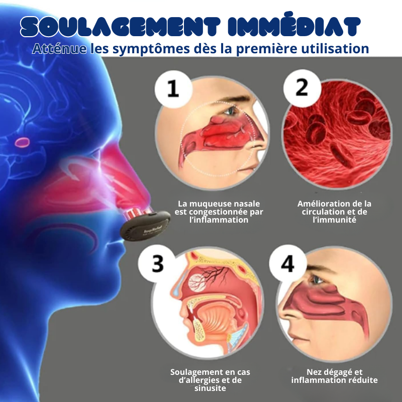 Cet appareil utilise la lumière rouge infrarouge (630–650 nm), reconnue pour ses effets bénéfiques sur les tissus mous. En pénétrant délicatement les muqueuses nasales, elle génère une chaleur douce qui favorise la vasodilatation, améliore la circulation sanguine locale et procure une sensation immédiate de dégagement et de relaxation. Cette technologie, appelée photobiomodulation, contribue à réduire les symptômes de la rhinite allergique et de la congestion nasale de manière naturelle.