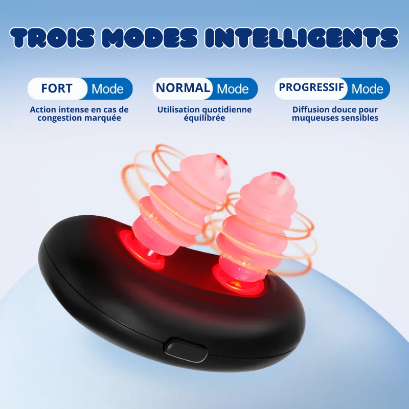 Compact, léger et totalement sans fil, l’appareil s’intègre facilement à votre routine. Ses embouts nasaux ergonomiques en silicone médical, doux et respectueux de la peau, épousent parfaitement la forme des narines sans gêner la respiration. Grâce à ses 3 modes intelligents, vous adaptez le traitement à votre sensibilité :
