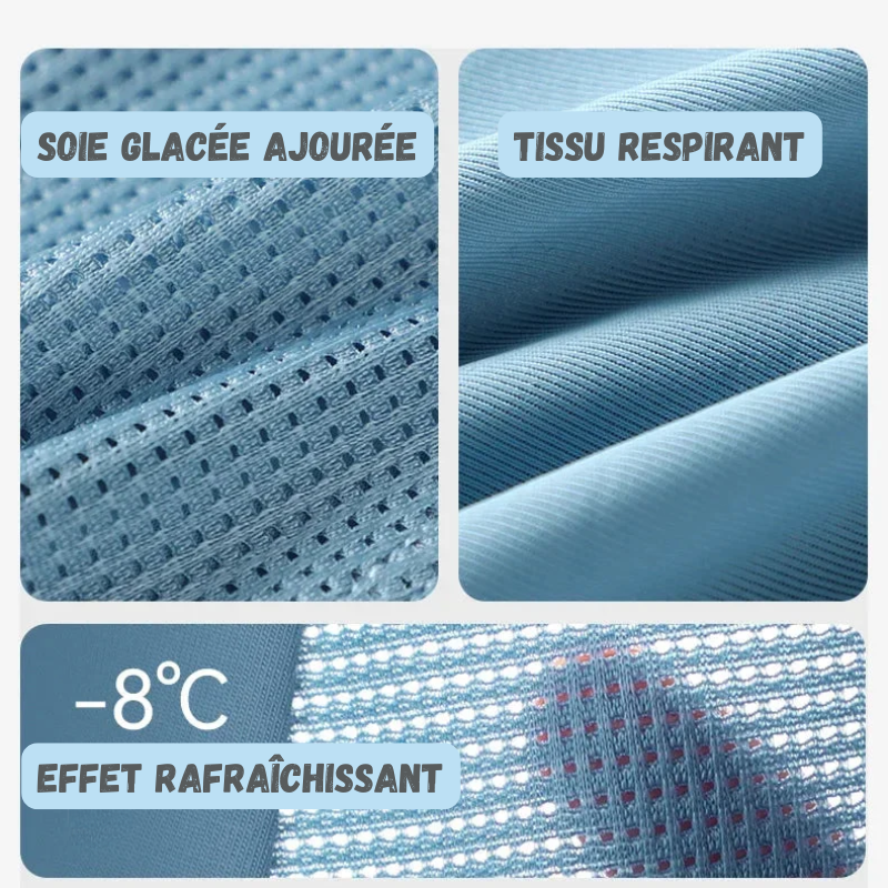 La soie glacée est une matière innovante qui offre une sensation de légèreté et de douceur extrême. Elle laisse respirer la peau, régule la température corporelle et évacue l’humidité, ce qui vous garantit une fraîcheur constante, même lors des journées les plus chaudes.