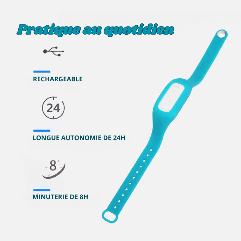 Grâce à ses 3 niveaux d’intensité, vous adaptez l’action du bracelet à votre sensibilité. Son bracelet réglable à 11 trous convient à la majorité des poignets, hommes comme femmes. Fabriqué en ABS doux et sûr pour la peau, il est agréable à porter toute la nuit. Son design élégant et mixte est disponible en noir ou turquoise, pour allier efficacité et style.