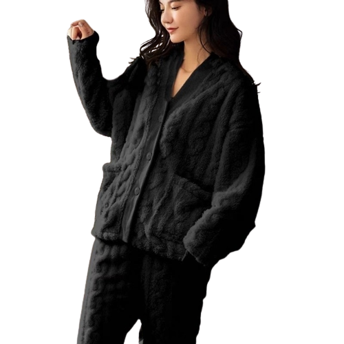 Cet ensemble est composé de deux pièces amples afin d'accroître son confort. Il est composé d'un cardigan à boutons en col V avec de grandes poches, ainsi qu'un pantalon assez large et élastique afin de vous laisser libre de vos mouvements durant votre soirée. Notre ensemble vous offre un style élégant, simple et décontracté à la fois !