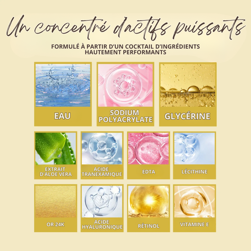 - Composition : Collagène, Or 24K, Extrait d’algues, Extrait d’aloe vera, Acide hyaluronique, Glycérine, Acide tranexamique, Lécithine, Rétinol, Vitamine E, Sodium Polyacrylate, Eau, EDTA...