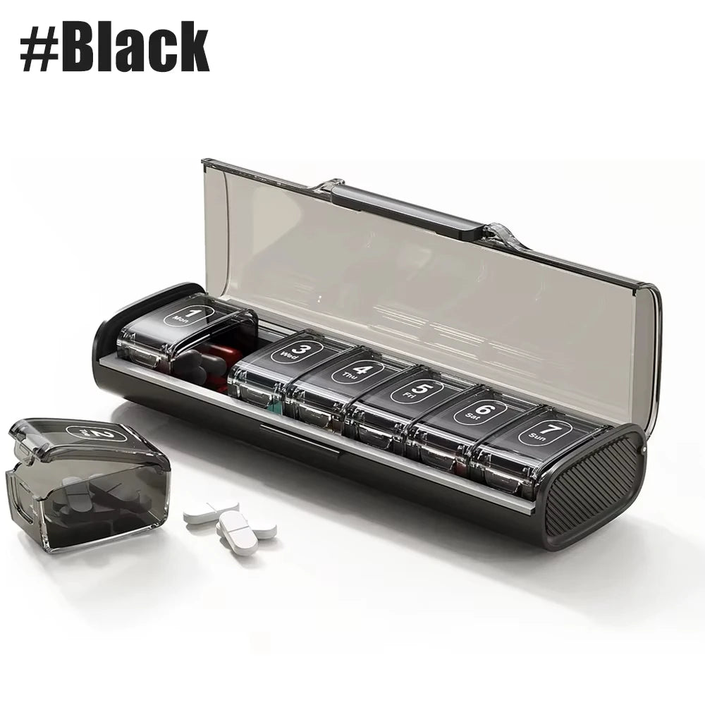 Vos comprimés sont en sécurité ! Chaque compartiment est muni d’un couvercle hermétique qui empêche les mélanges ou les chutes accidentelles, tout en préservant vos médicaments de l’humidité, de la lumière et de l’air. La boîte principale est dotée d’un joint en silicone étanche et d’une ouverture à boucle solide pour une protection maximale. Chaque mini-boîte dispose également d’un système de verrouillage interne garantissant une fermeture fiable et sans fuite.
